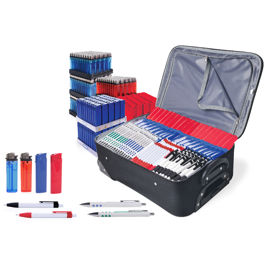 Werbeartikel Kugelschreiber, Feuerzeuge, Trolleykoffer | 1001 Teile inkl. Druck | 4-farbig | Werbeset, Werbegeschenk