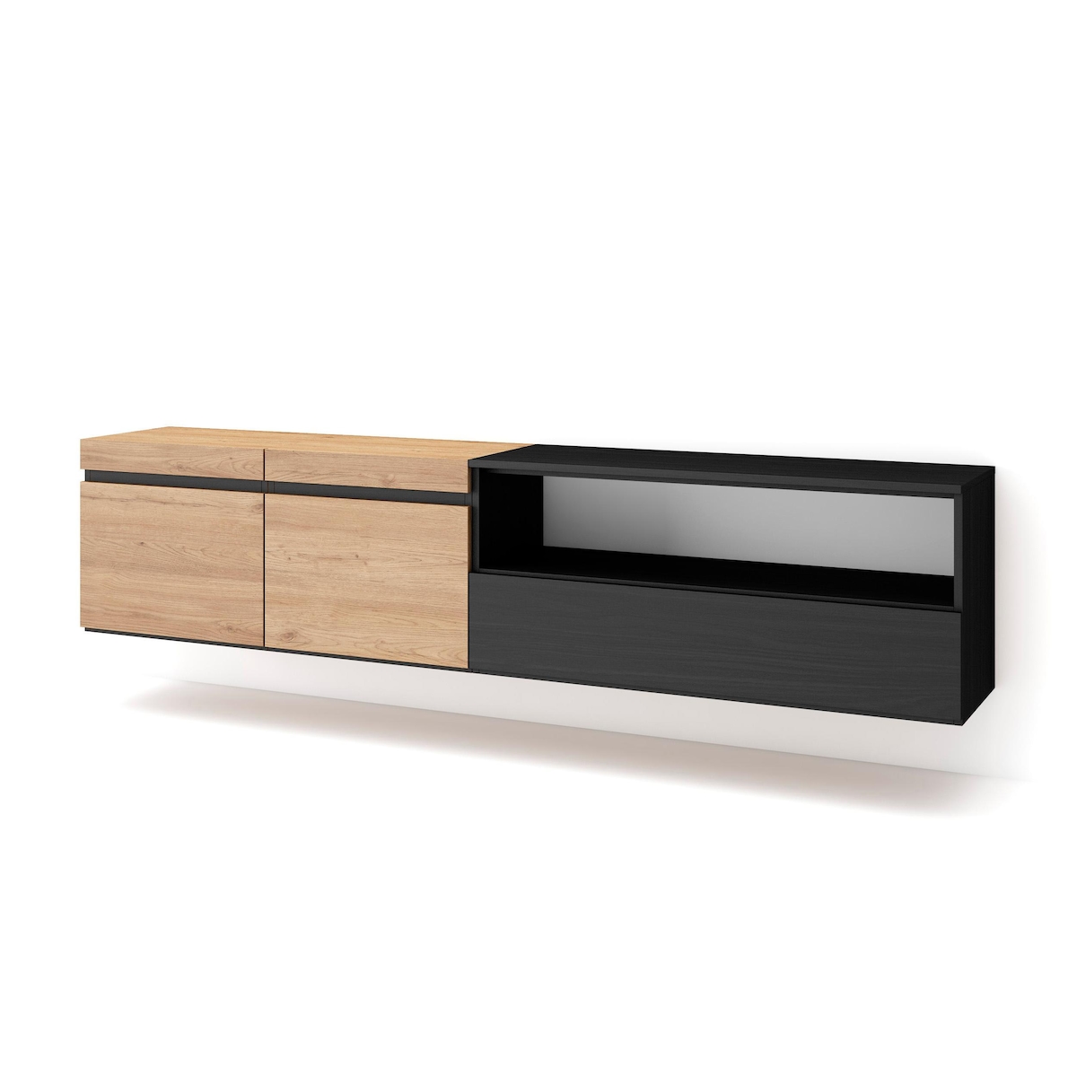 SKRAUT HOME Wohnzimmer-TV-Schrank, Viel Stauraum, 200x35x45cm, Für TV-Geräte bis 80“, Hängend, Moderner Stil, Eiche und Schwarz _ 47_29