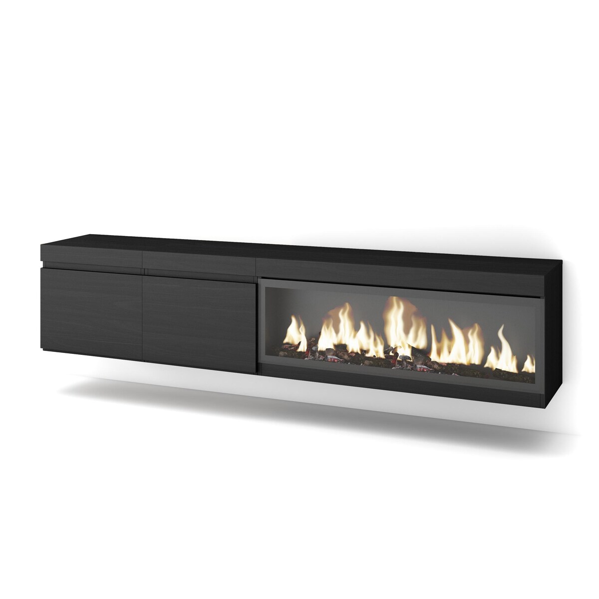 TV-Schrank, Lowboard, 200x35x45cm, Für TV-Geräte bis zu 80", Elektrokamin, Hängend, Schwarz