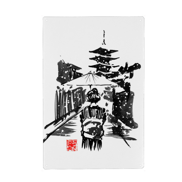 Holzbild "Geisha in front of pagoda" artboxONE - Natur,Schwarzweiß - Geisha,Pagoda,Umbrella,Kimono