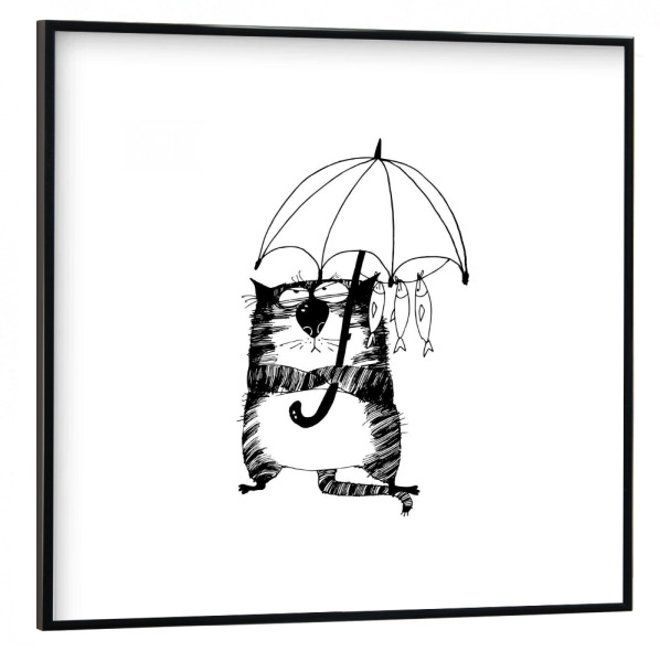 Poster mit schwarzem Rahmen 30x30 cm "Umbrella Kater" artboxONE - Schwarzweiß,Stift & Papier,Illustration - Katze,Cat,Catcontent,Schirm,Fische