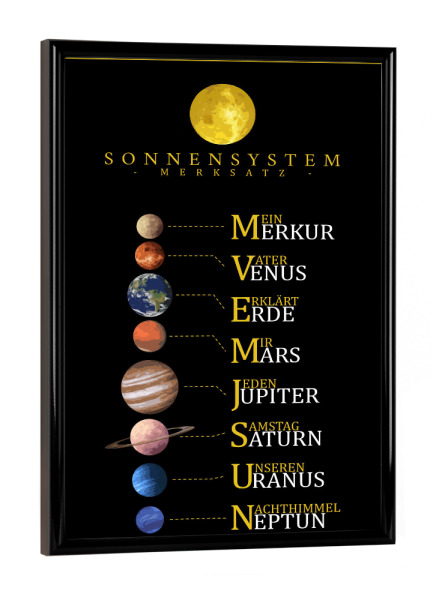 Poster mit schwarzem Rahmen "Unser Sonnensystem - Merksatz" artboxONE - Lehrersprüche,Galaxy