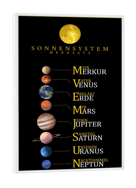 Poster mit weißem Rahmen "Unser Sonnensystem - Merksatz" artboxONE - Lehrersprüche,Galaxy