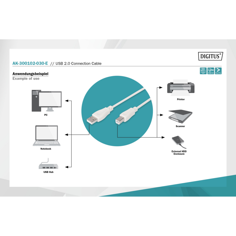 Digitus USB 2.0 Anschlusskabel USB-A (Stecker) > USB-B (Stecker) Kabel, beige, 3