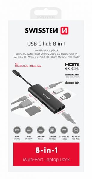 Swissten USB-C HUB 7-IN-1 (USB-C 100W, HDMI 4K, 1x USB-A 3.0, 2x USB-A 2.0, SD, MICRO SD) Aluminium - Swissten