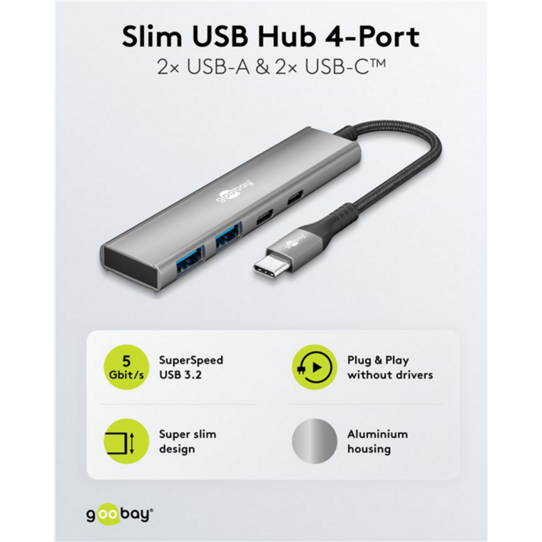 goobay Slim 4-Port USB-C auf USB-C/USB-A 5 Gbit/s USB-Hub, grau