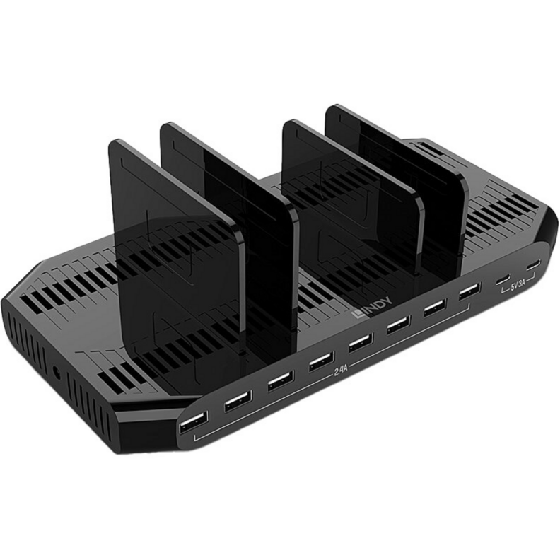 Lindy 120W 10 Port USB-Ladestation, 8x USB-A + 2x USB-C, schwarz/grau, QC 3.0