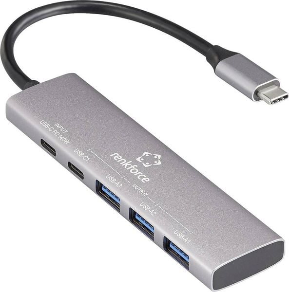 Renkforce RF-6676604 USB-Hub 3+1 Port USB-A, USB-C USB 3.2 Gen1 5 GBit/s mit Aluminiumgehäuse, USB-C PD Ladeanschluss Grau RF-USBH-300