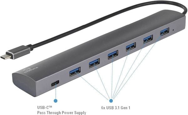 Renkforce RF-3374946 USB-Hub 6+1 Port USB-A USB 3.2 Gen1 5 GBit/s mit Pass-Through Stromanschluss, mit Aluminiumgehäuse Silber