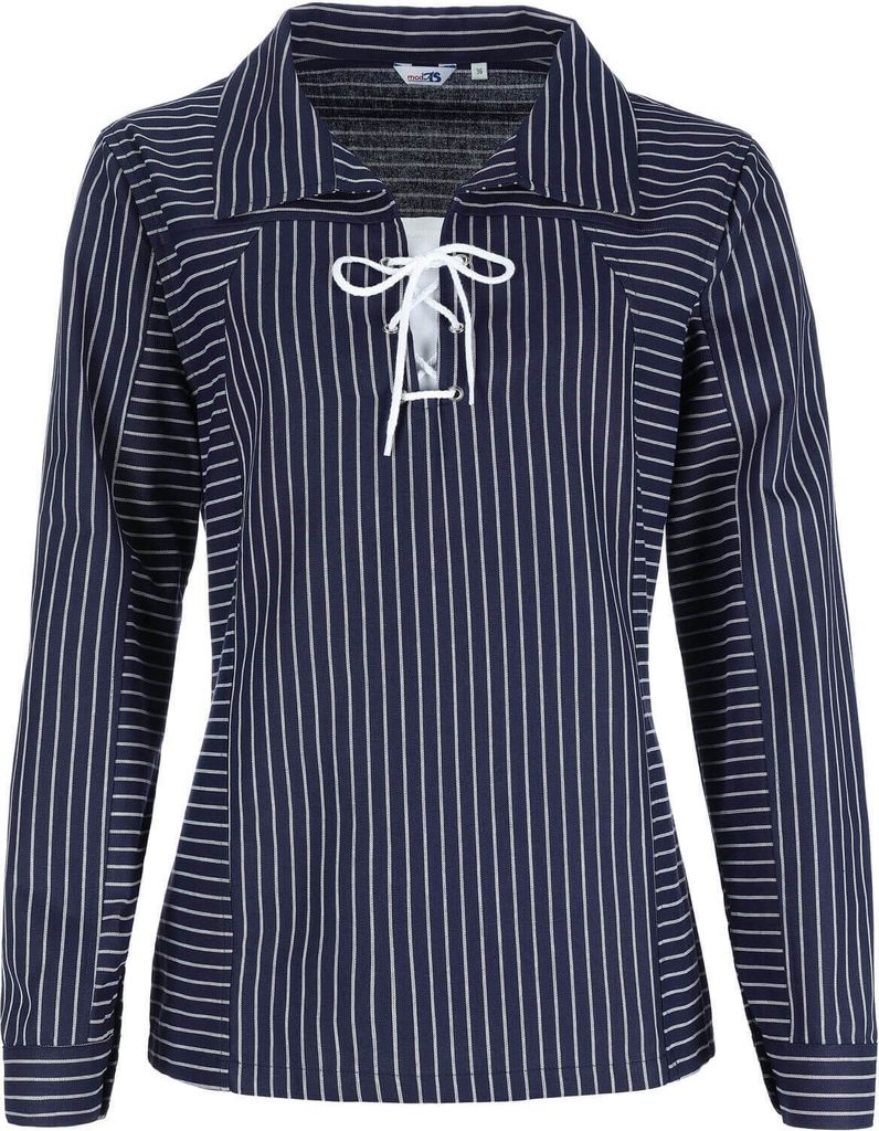 modAS Damen Takelhemd mit V-Ausschnitt mit Kordelschnürung - Maritimes Fischerhemd mit schmalen Streifen Blau Größe 38