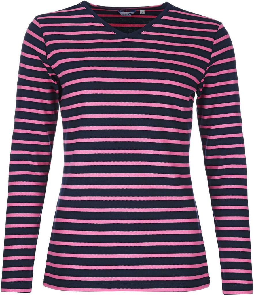 modAS Damen Shirt mit Streifen und V-Ausschnitt - Bretonisches Streifenshirt Langarm aus Baumwolle in Blau-Magnolia Größe 46
