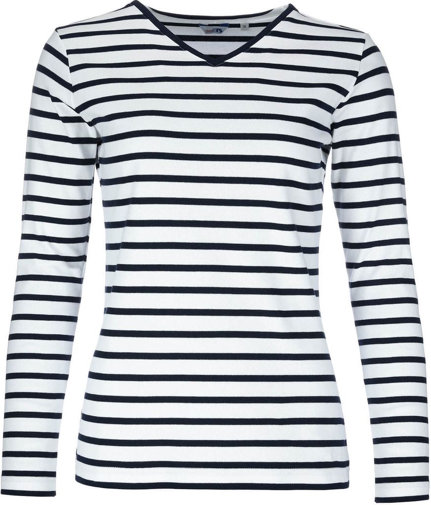 modAS Damen Shirt mit Streifen und V-Ausschnitt - Bretonisches Streifenshirt Langarm aus Baumwolle in Weiß-Blau Größe 48