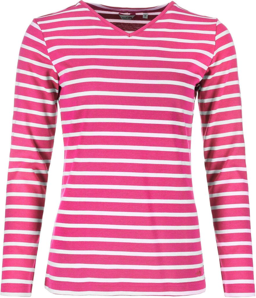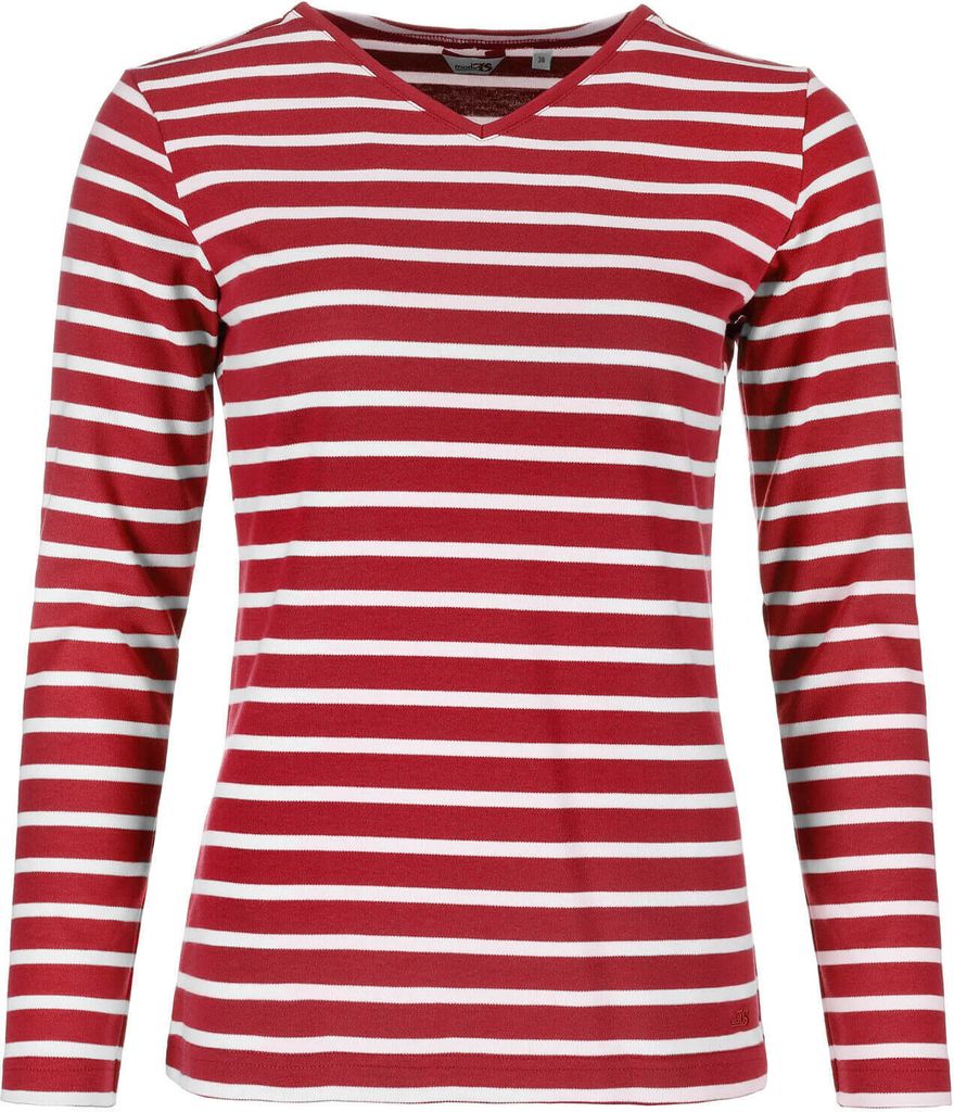 modAS Damen Shirt mit Streifen und V-Ausschnitt - Bretonisches Streifenshirt Langarm aus Baumwolle in Rot-Weiß Größe 44