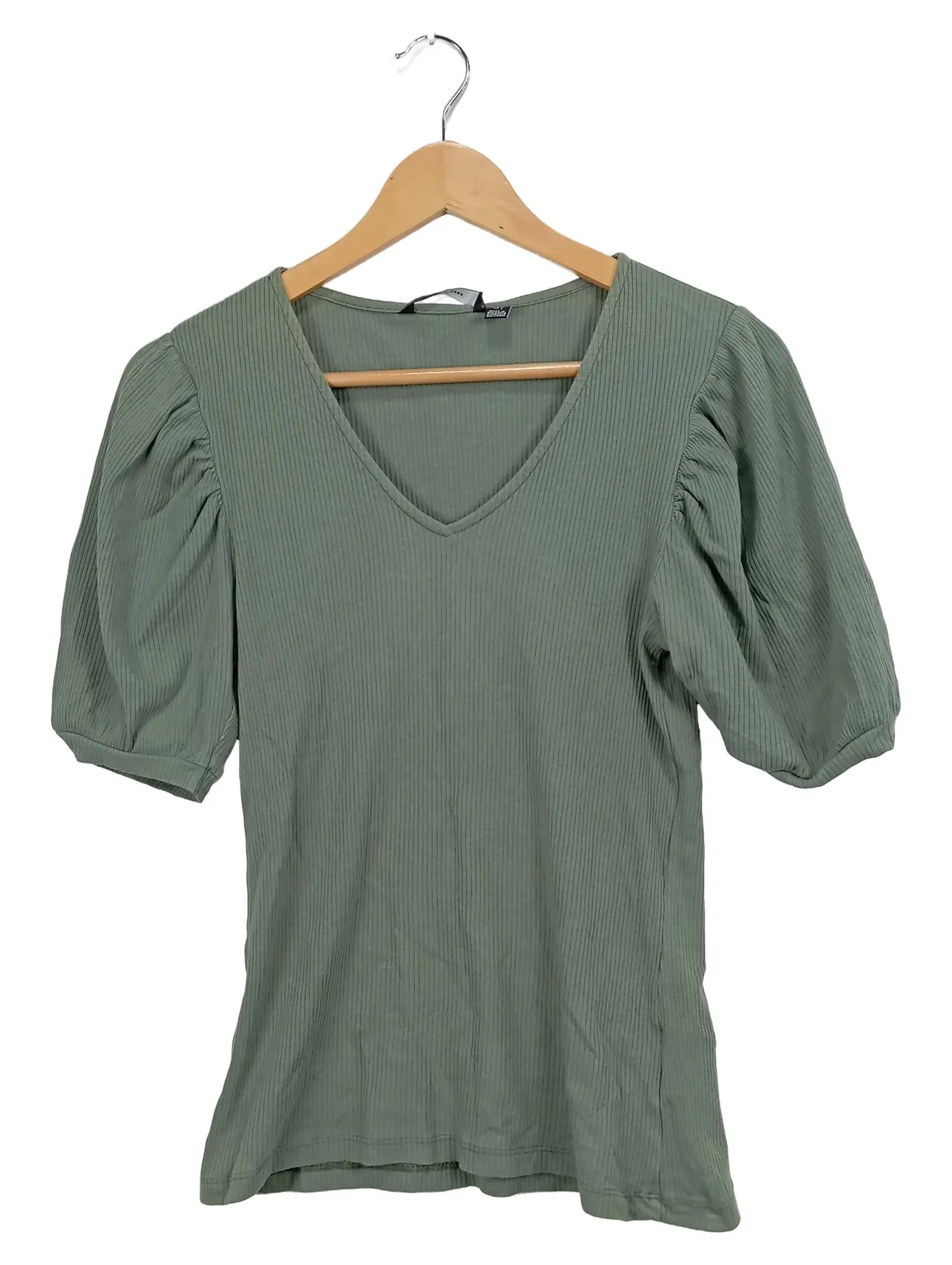 VERO MODA Damen T-Shirt Gr. 40/L Grün V-Ausschnitt Puffärmel Rippstrick