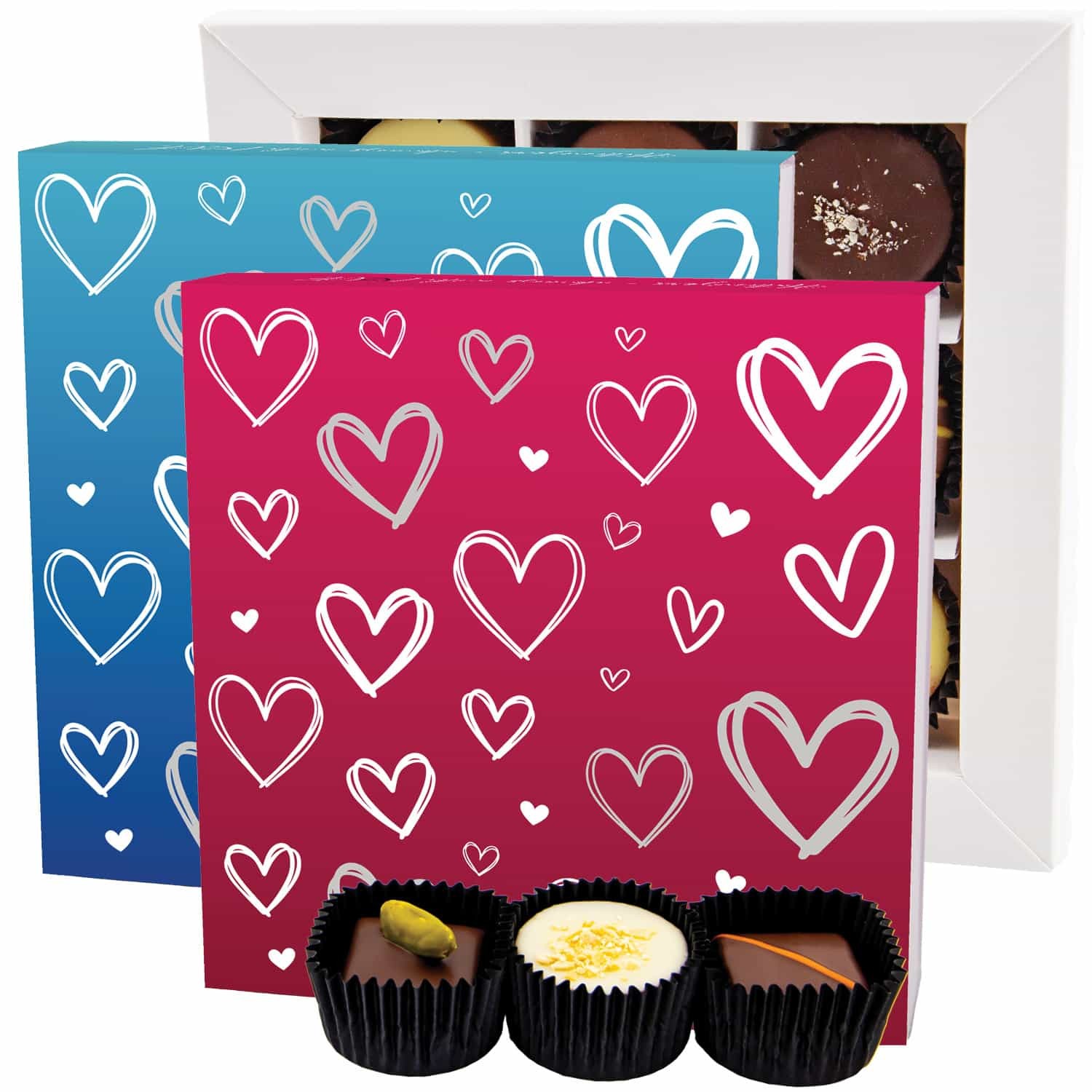 Pralinen Geschenk Valentinstag – handmade ohne Alkohol aus Edelkakao-Schokolade edle Geschenkdose "Pink&Blue Hearts L", für ihn & für sie Freundin Par
