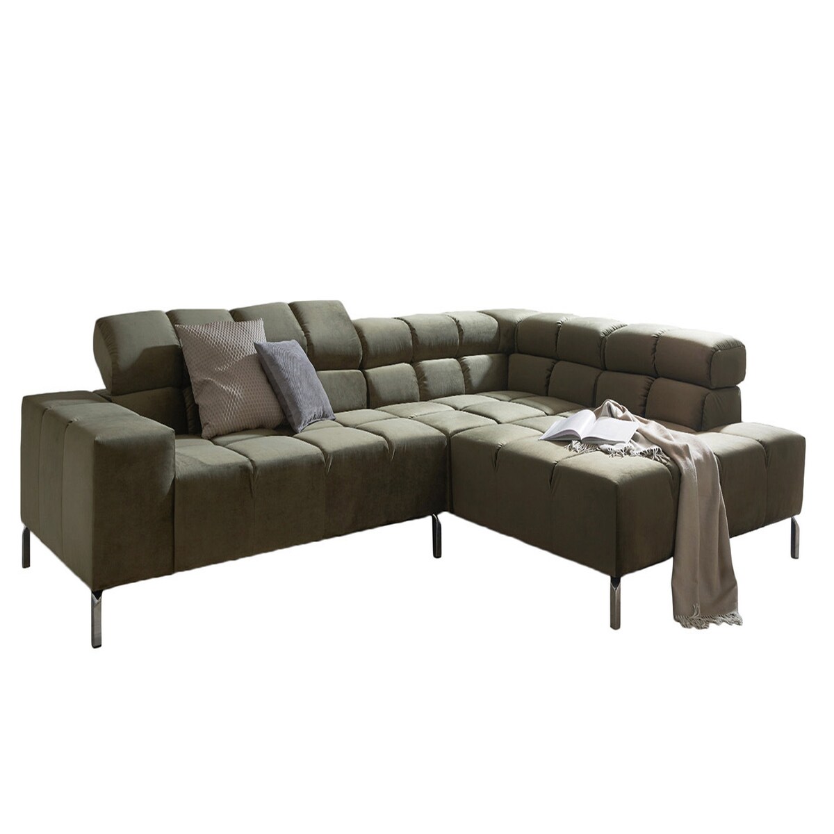 KAWOLA Sofa NELSON Ecksofa Velvet olivgrün Recamiere rechts mit motorischem Sitzvorzug