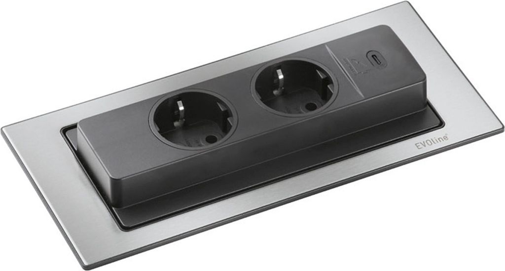 EVOline Backflip Steckdose - versenkbare Steckdose 2 fach mit USB-C Charger, Kunststoff / Edelstahl gebürstet nanobeschichtet