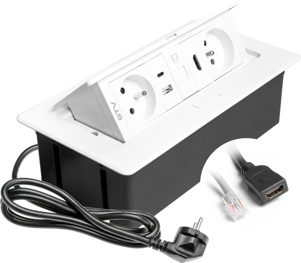 GTV - Einbausteckdose MULTISOFT weiß mit 2X Steckdose mit Erdung, USB A+C, RJ45, HDMI 2.0, versenkbar mit Abdeckung, 1,5?m Kabel, ideal für Küch...