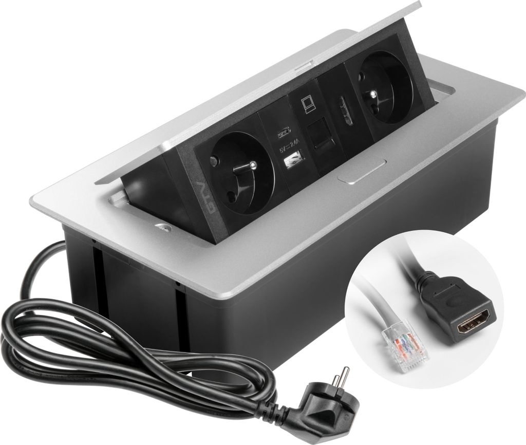 GTV - Einbausteckdose MULTISOFT aluminium mit 2x Steckdose mit Erdung, USB A+C, RJ45, HDMI 2.0, versenkbar mit Abdeckung, 1,5?m Kabel, ideal für K...