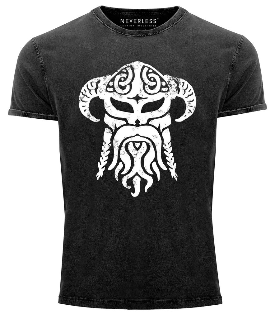 Herren Vintage Shirt Viking Wikinger Helm Nordmänner Printshirt T-Shirt Aufdruck Used Look Slim Fit Neverless schwarz XXL