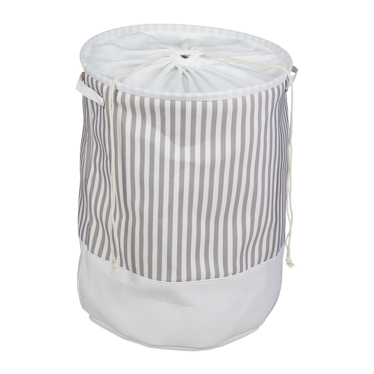 Relaxdays Wäschekorb mit Kordelzug, 60 l, faltbar, tragbar, Stoff, Wäschesammler Streifen, HxD: 56 x 42,5 cm, weiß/grau