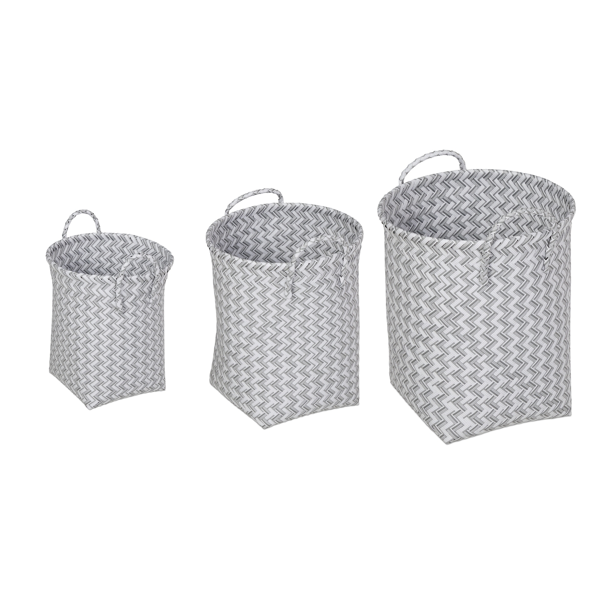 Relaxdays Wäschekorb geflochten, 3er Set Aufbewahrungskörbe, 3 Größen, Spielzeugkorb mit Henkel, Kunststoff, weiß/grau