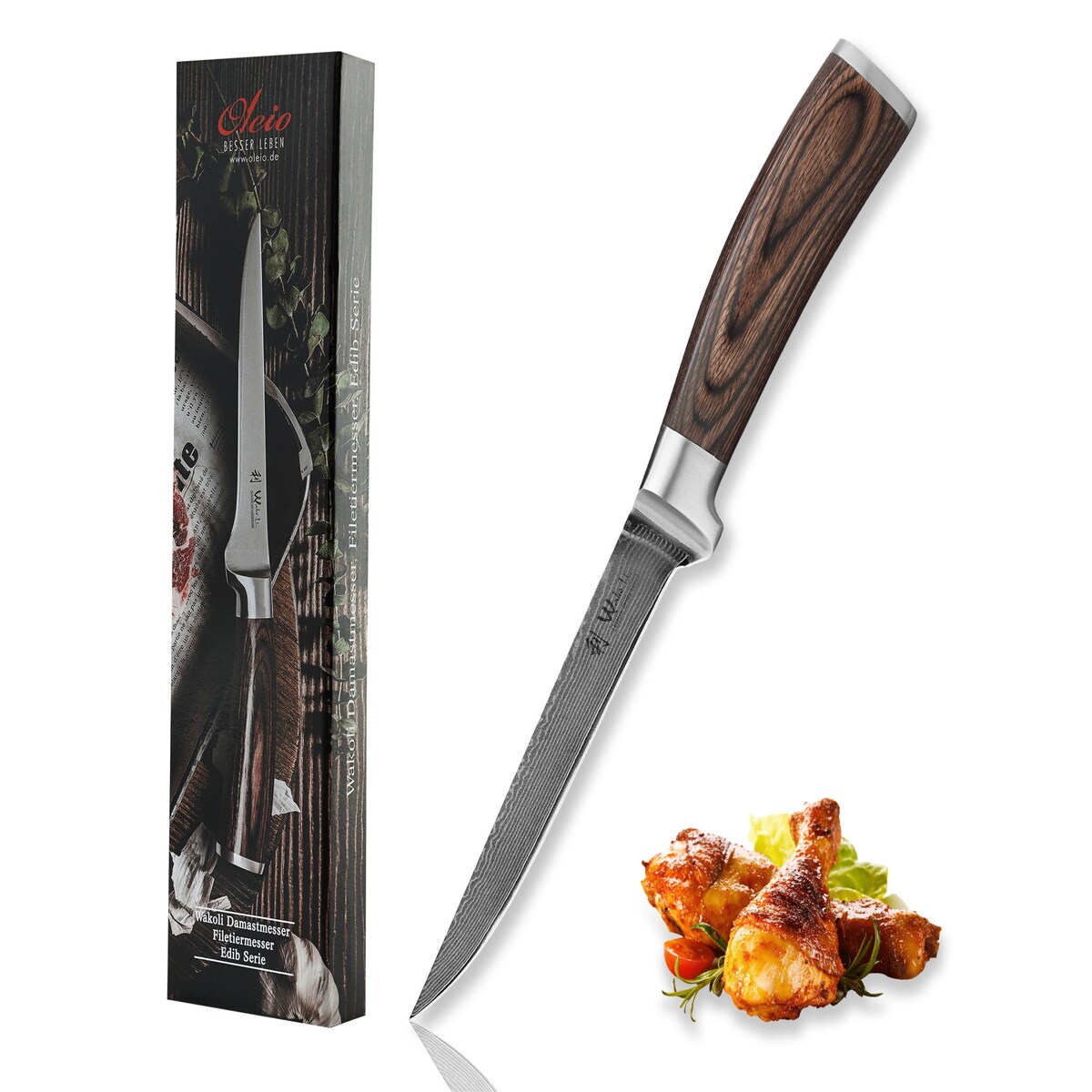 Wakoli Nussbaum Damast Ausbein- und Filetiermesser I 16,5 cm Klinge I Nussbaumholzgriff
