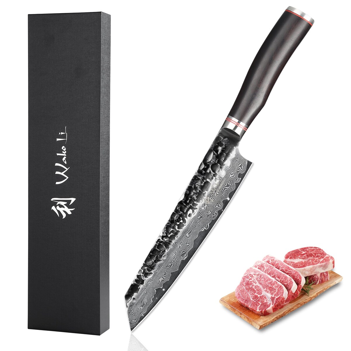 Wakoli EBO Damast Fleischmesser Kiritsuke 20cm Klinge schwarzer Eichenholzgriff