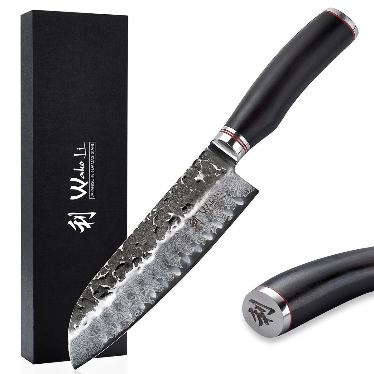 Wakoli EBO Damast Santokumesser I 18 cm Klinge mit Hammerschlag I schwarzer Eichenholzgriff