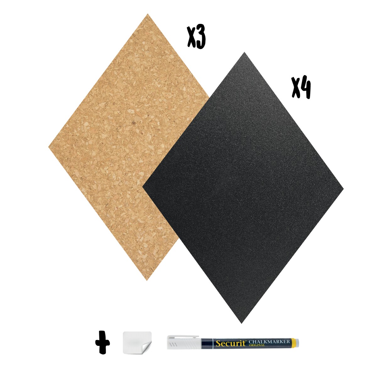 Securit Set mit 7 Schiefer- und Kork-Wandtafeln – Diamant – Kreidemarker und Befestigung inklusive