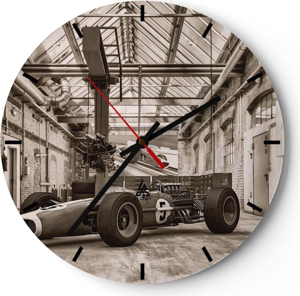 Wanduhr - Rund - Glasuhr - Formel 1 Retro - 40x40cm - Schleichendes Uhrwerk - Lautlos - zum Aufhängen bereit - Dekoration Modern - Wanddekoration ...