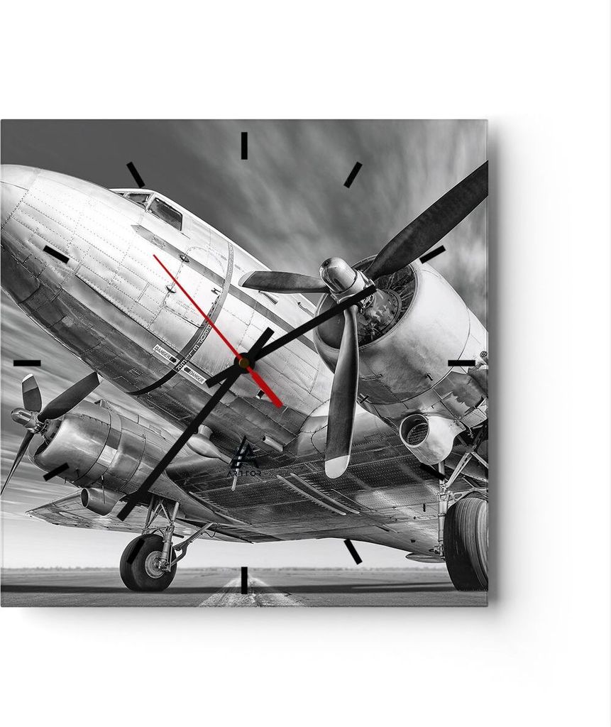 Wanduhr - Quadrat - Glasuhr - Flugzeug Retro Flugzeug - 40x40cm - Schleichendes Uhrwerk - Lautlos - zum Aufhängen bereit - Dekoration Modern - Wan...