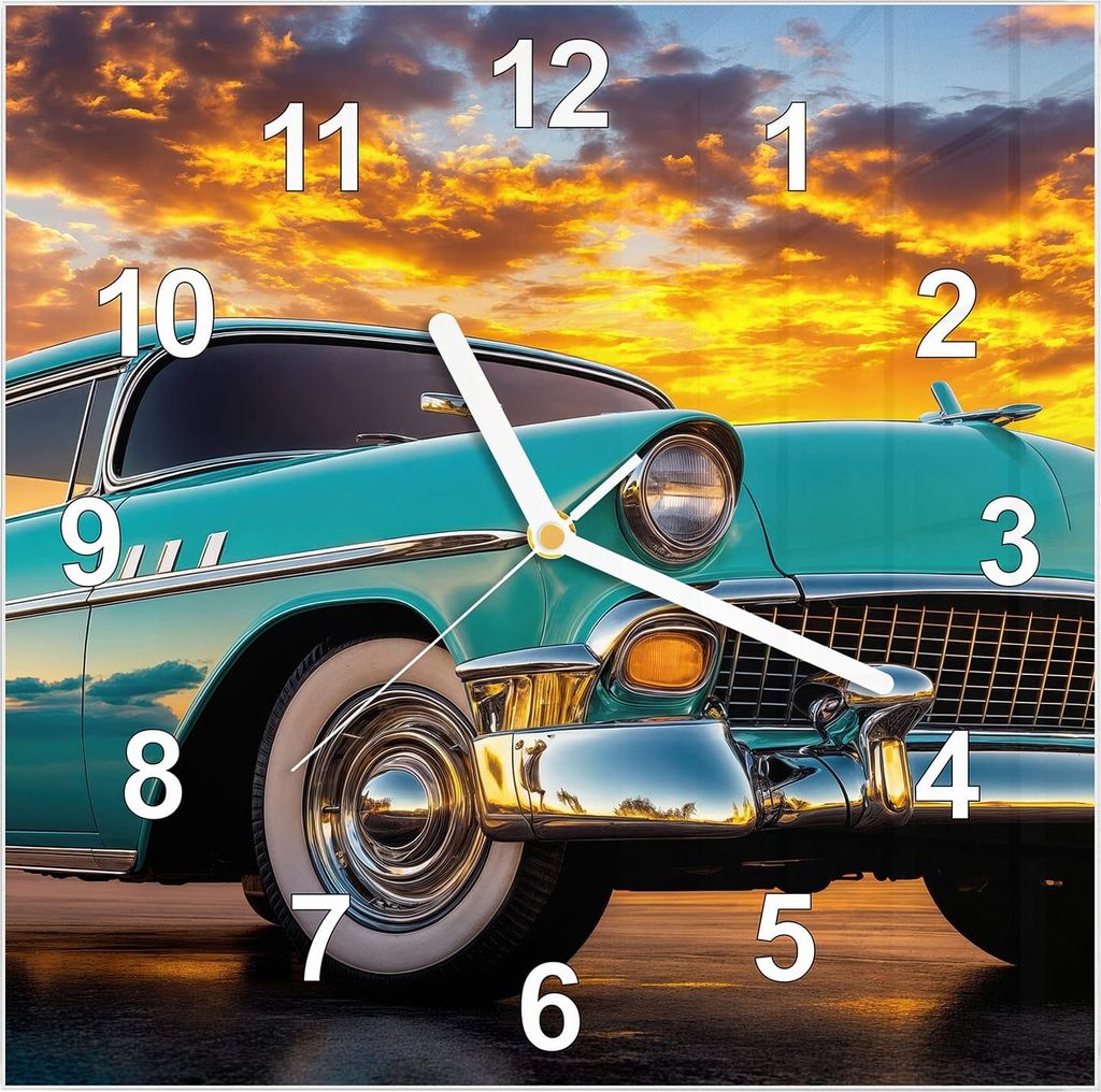 Wanduhr aus Glas mit Motiv Retro Oldtimer- 30 x 30 cm - inkl. Aufhängesystem