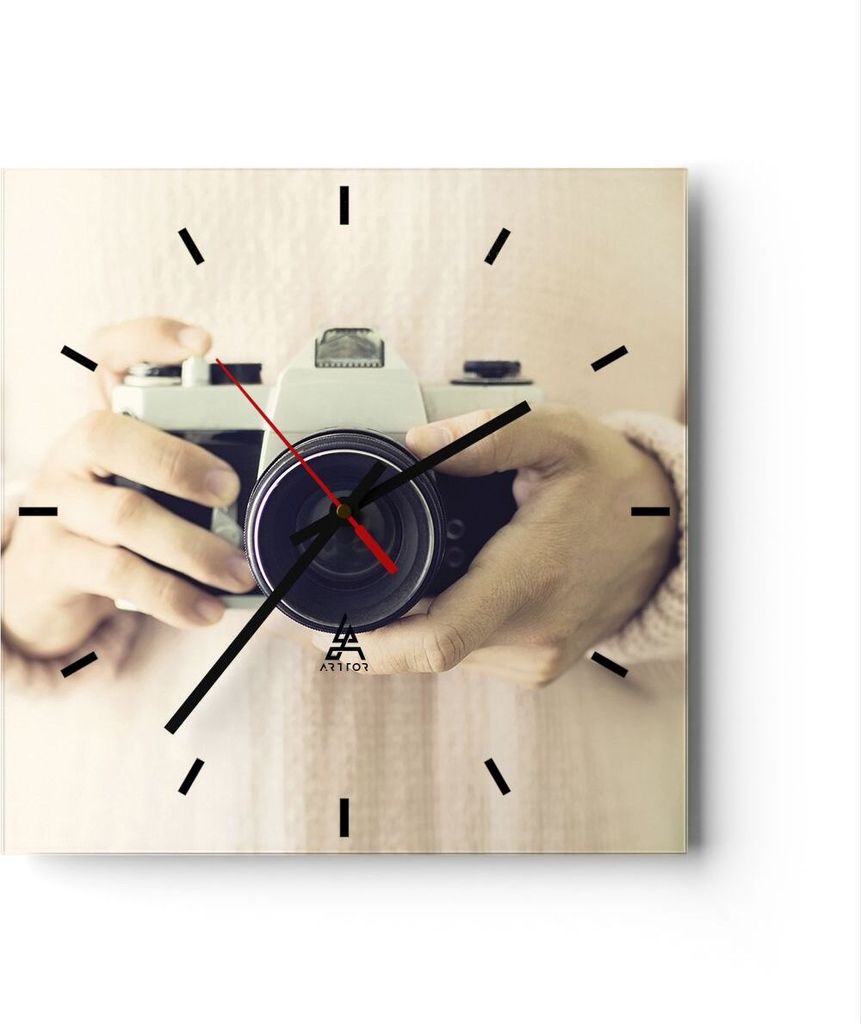 Wanduhr - Quadrat - Glasuhr - Die Kamera Retro Vintage - 30x30cm - Schleichendes Uhrwerk - Lautlos - zum Aufhängen bereit - Dekoration Modern - Wa...