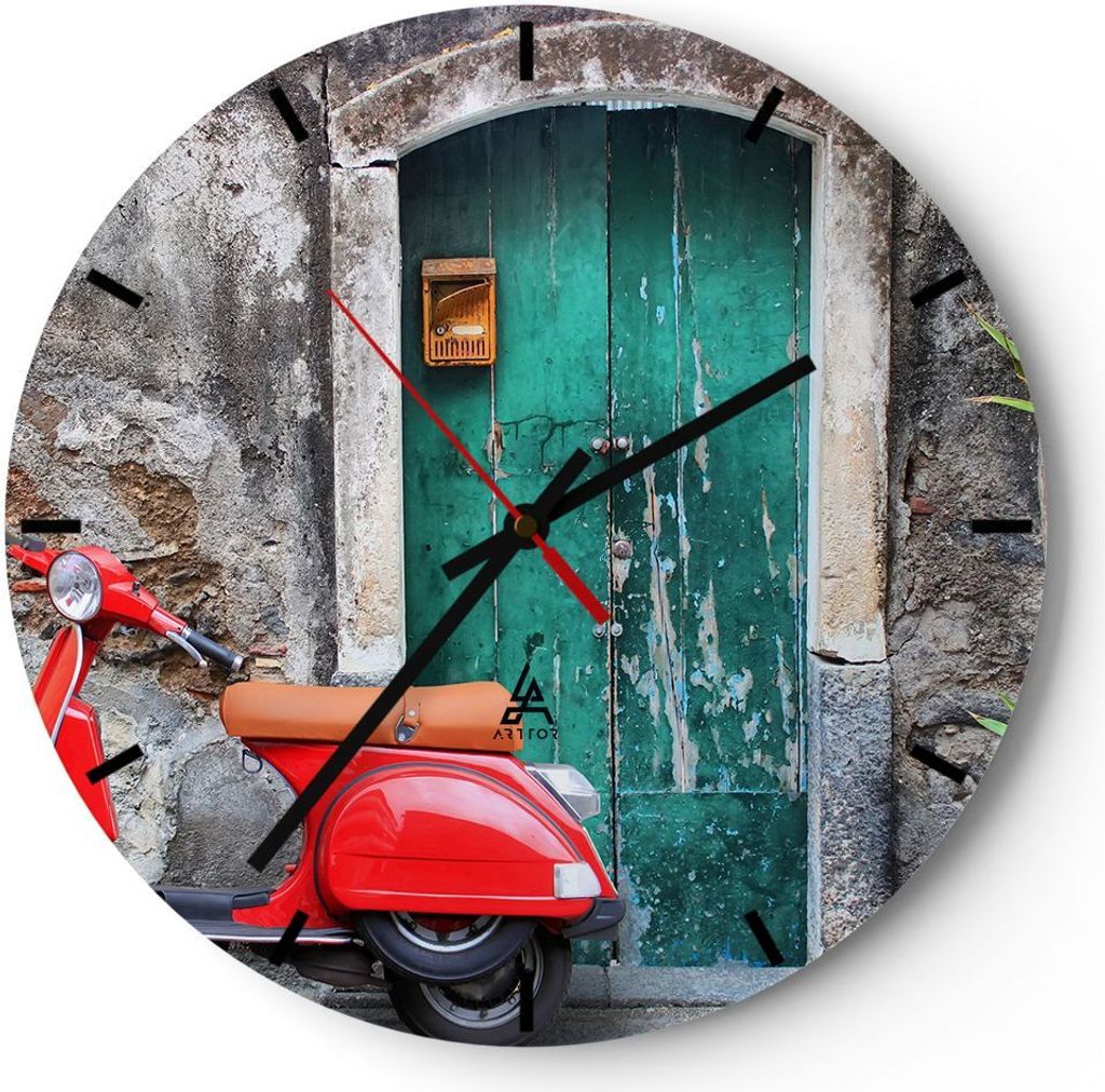 Wanduhr - Rund - Glasuhr - Scooter transport italien retro - 30x30cm - Schleichendes Uhrwerk - Lautlos - zum Aufhängen bereit - Dekoration Modern ...