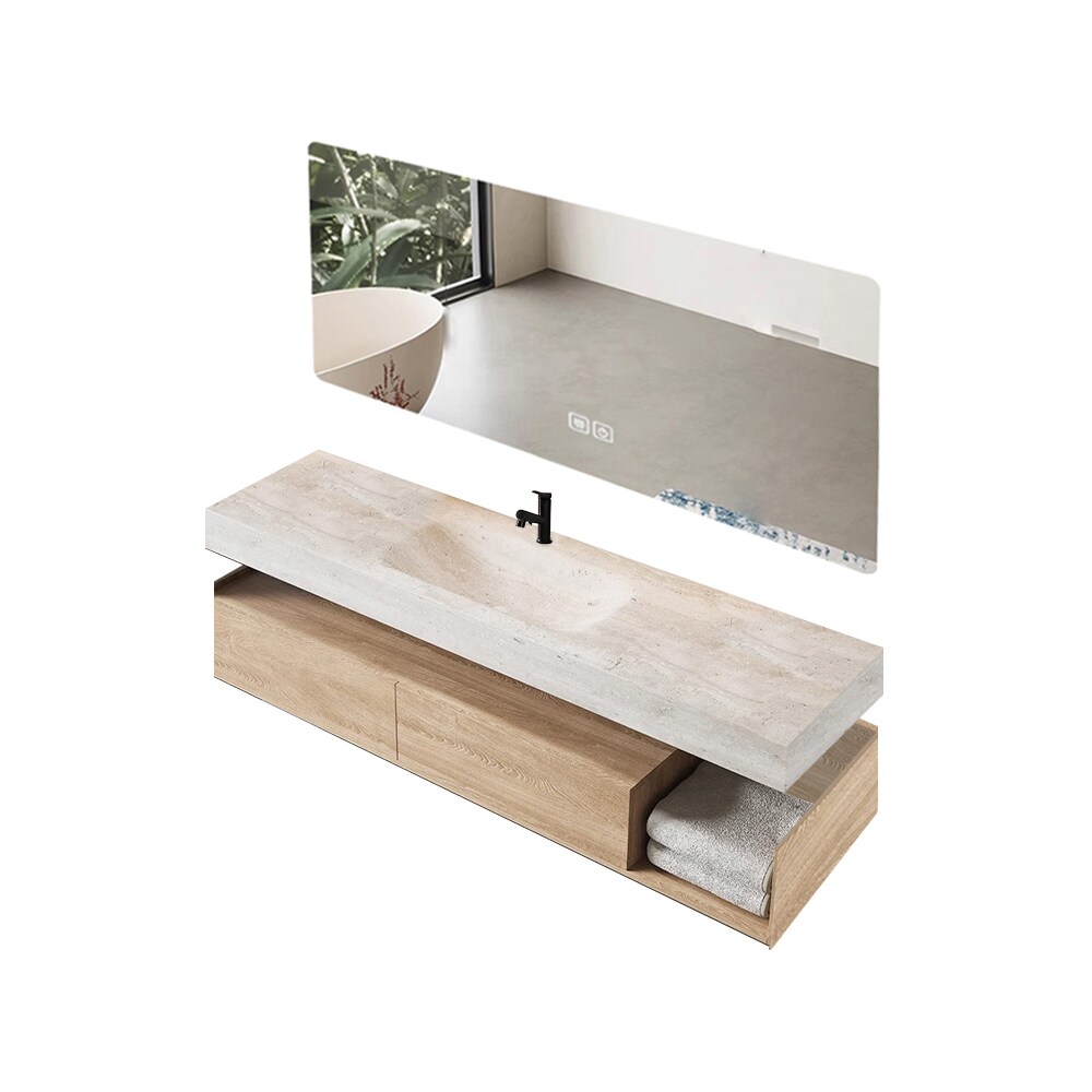 Wandhängendes Badmöbel-Set Travertin-Look mit Sinterstein Waschbecken Spiegel Unterschrank Ablage mit Armaturloch 120×55 cm【YT9865-120 K】