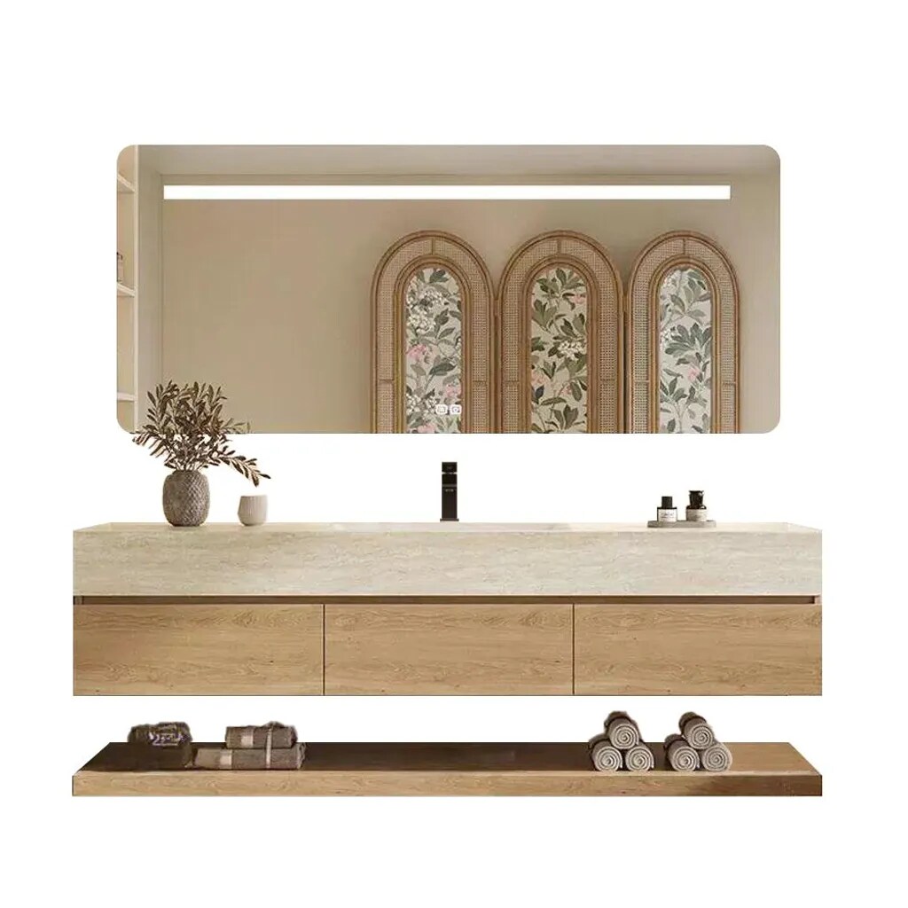 Wandhängendes Badmöbel-Set Travertin-Look mit Sinterstein Waschbecken Spiegel Unterschrank Ablage mit Armaturloch 120×55 cm【RW9865-120 K】