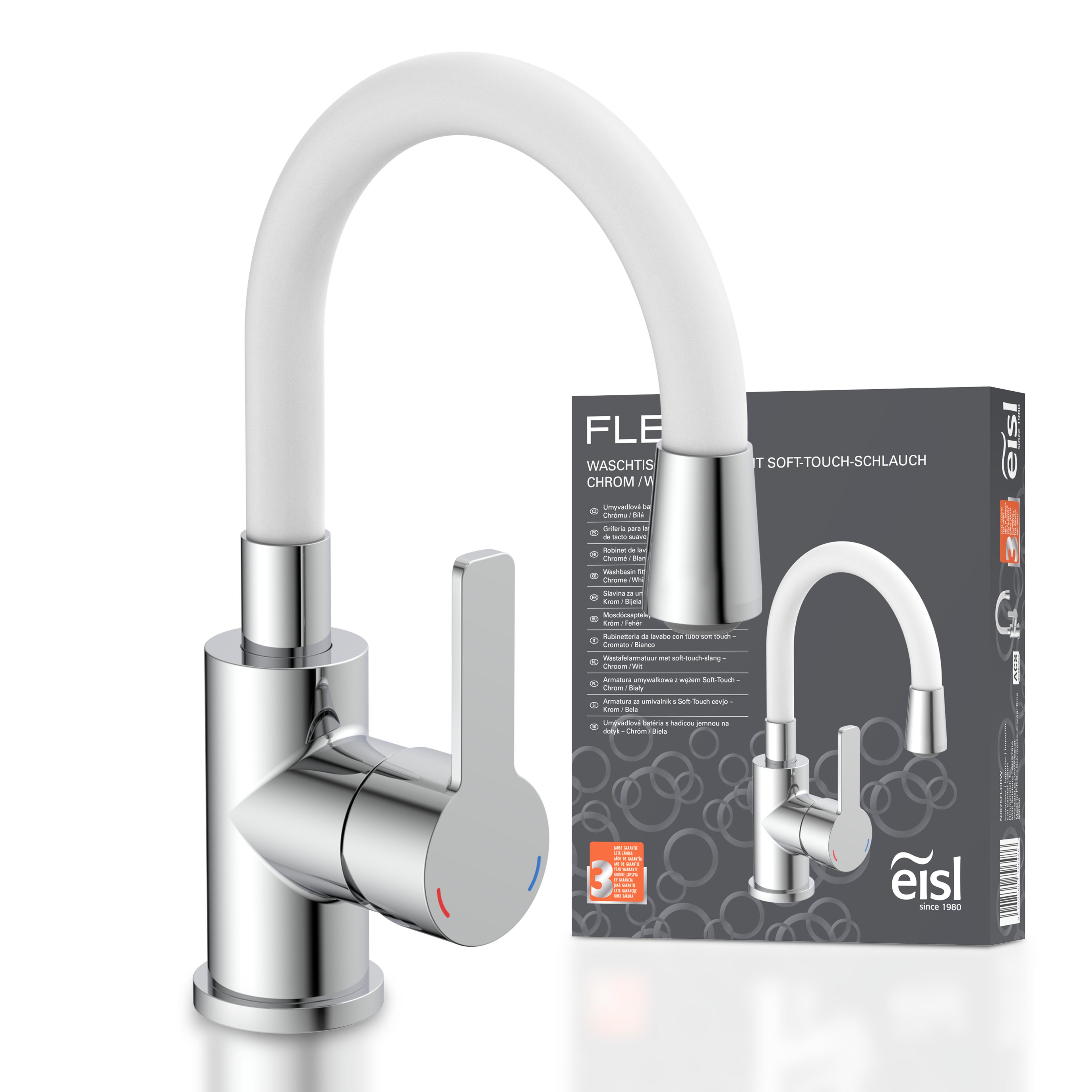 EISL Waschtischarmatur FLEXO, Chrom/Weiß, Waschbeckenarmatur mit flexiblem Auslauf, Hochdruck, mit Energiesparfunktion Cold Start