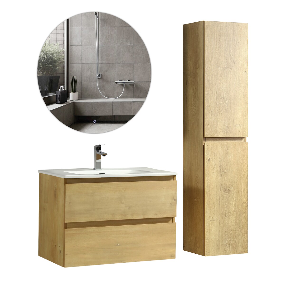 Alpenberger Badmöbel Set mit Hochschrank und Badspiegel Rund | Waschtisch mit Unterschrank Badezimmermöbel | Waschbecken mit Waschbeckenunterschrank