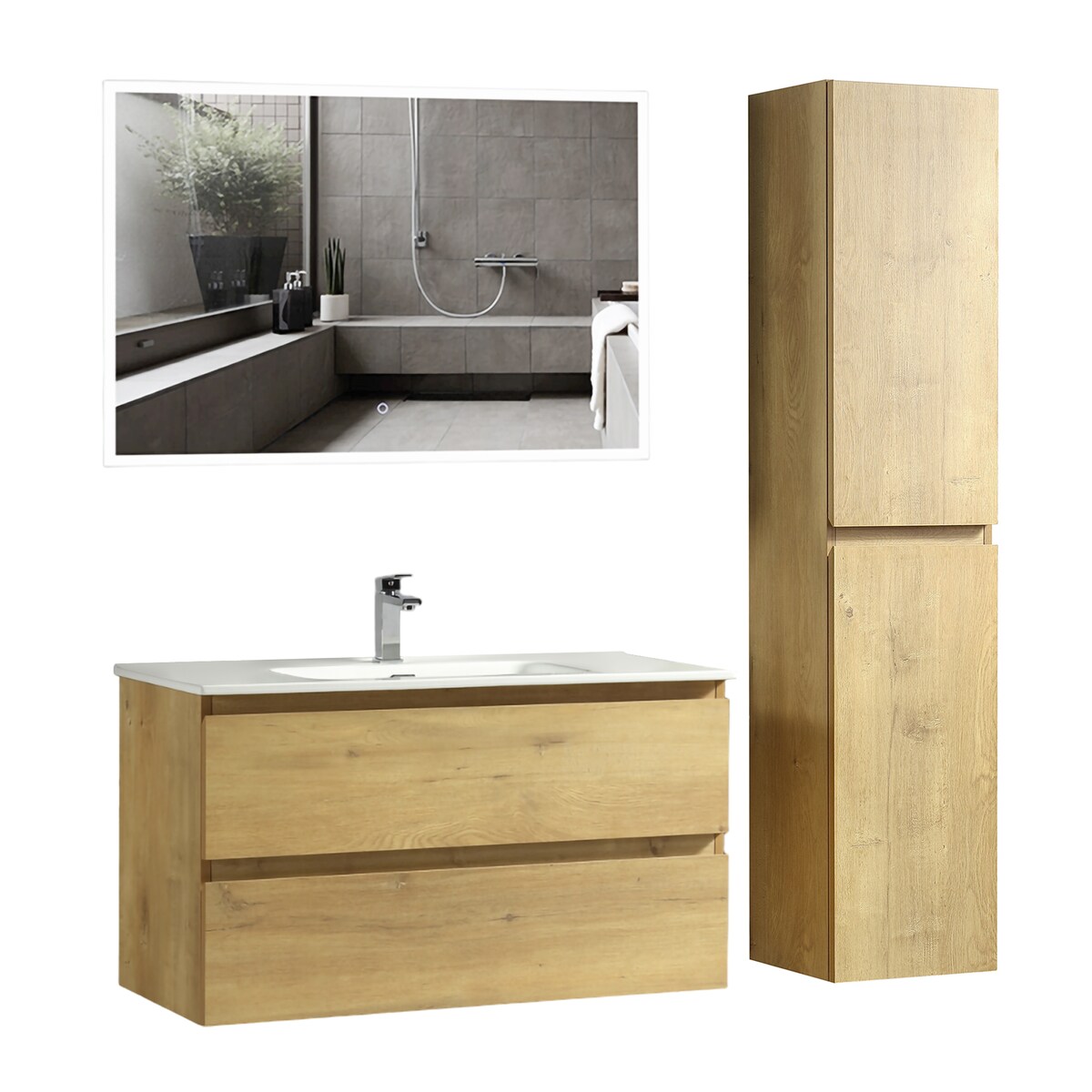 Badmöbel Set Wotaneiche mit Rillenoptik 60 cm Waschtisch-Unterschrank mit Keramik Waschbecken 2 Hochschränke LED-Spiegel