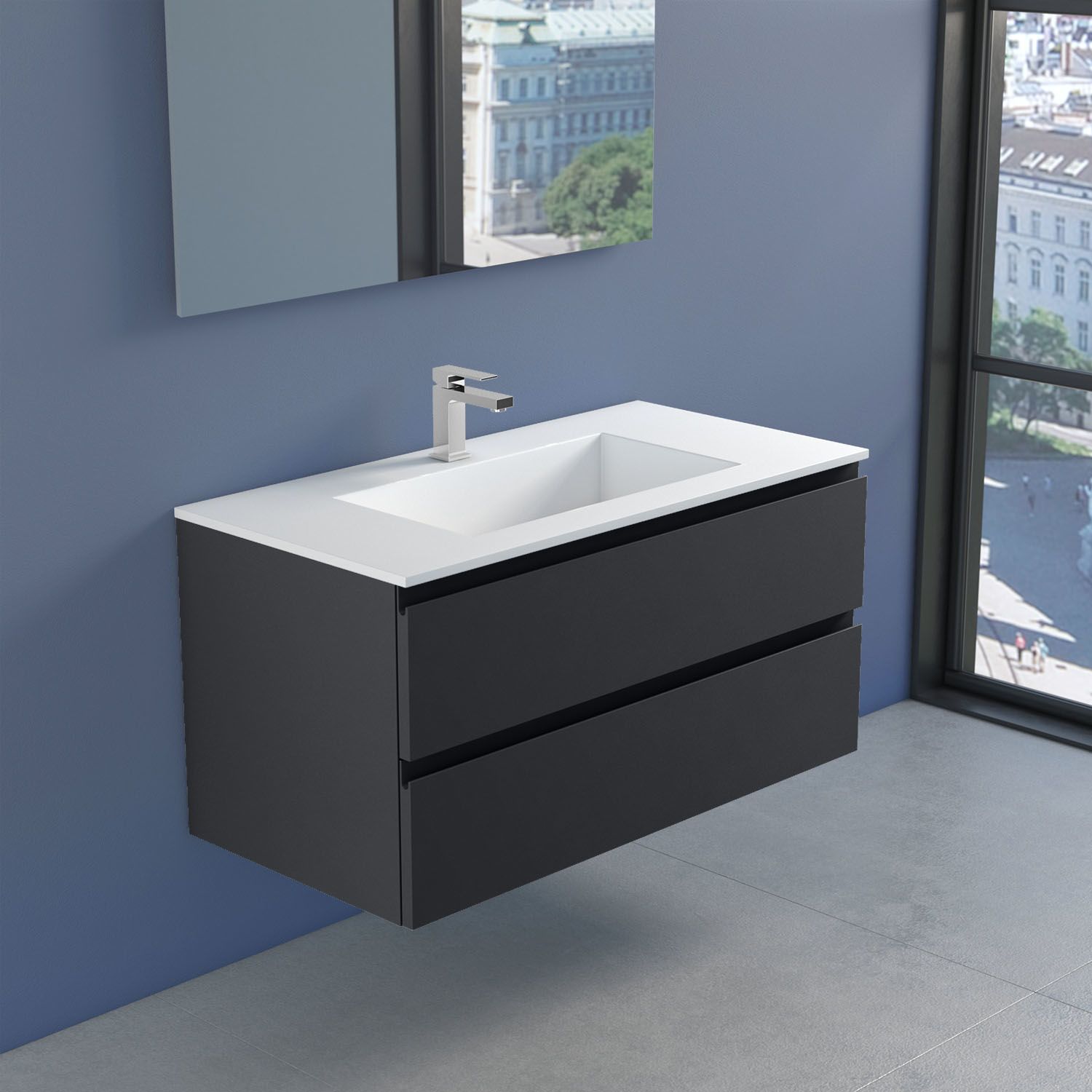 Planetmöbel Badmöbel-Set Waschtisch mit Unterschrank 40 cm & Spiegelschrank 40 cm & Midischrank Anthrazit