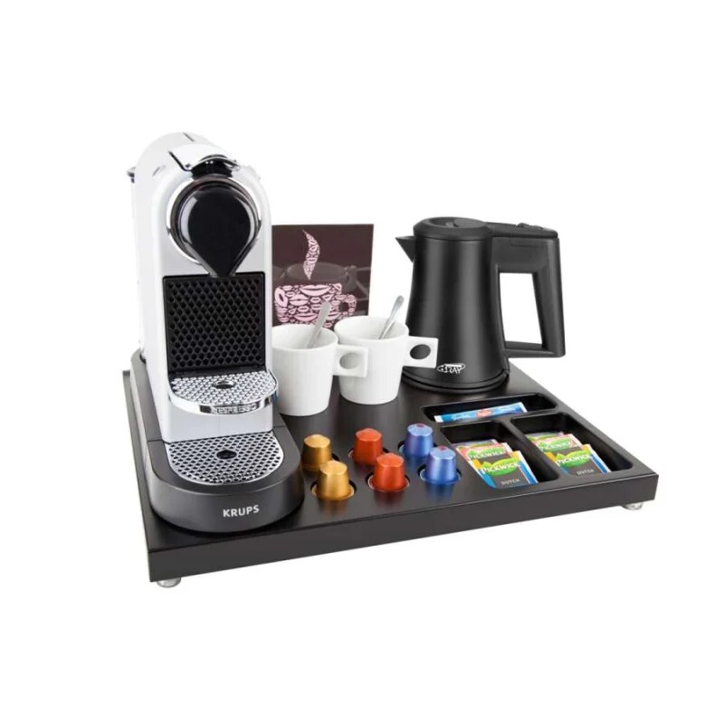 Willkommenstablett SUPREME Schwarz-Braun mit Wasserkocher STAR 0,5 L Schwarz und 2 weiße Porzellantassen mit A5 Prospekthalter