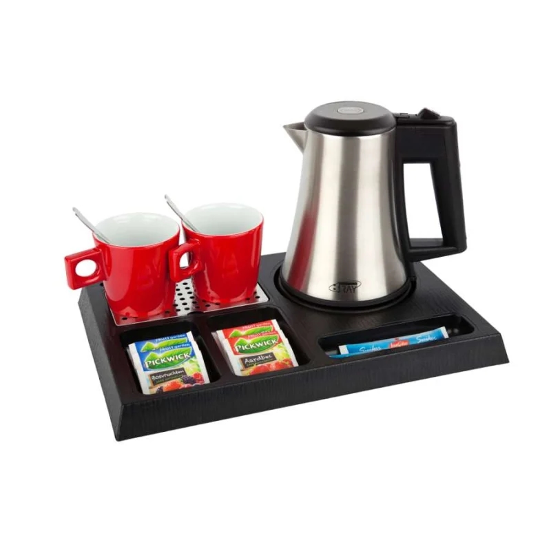 Willkommenstablett STAY Schwarz mit Wasserkocher STAR 0,5 L Edelstahl und 2 rote Porzellantassen