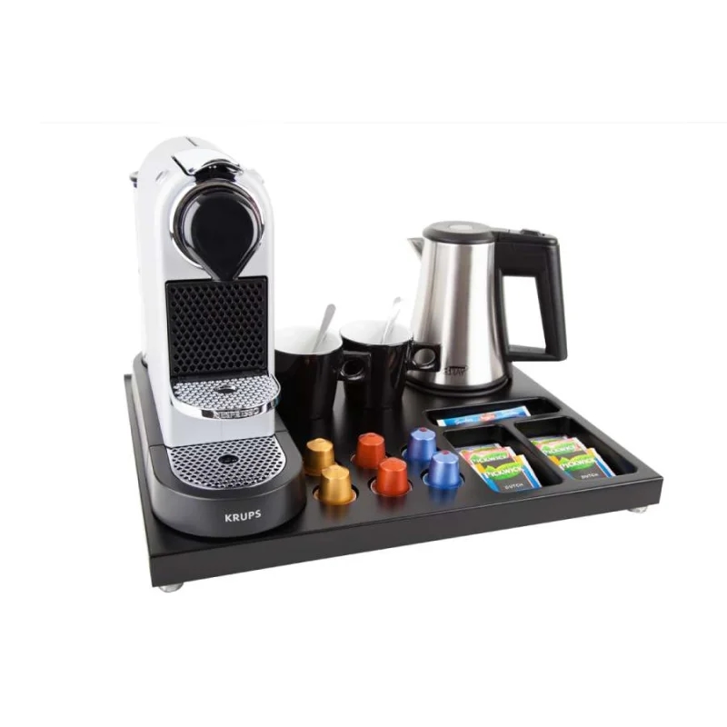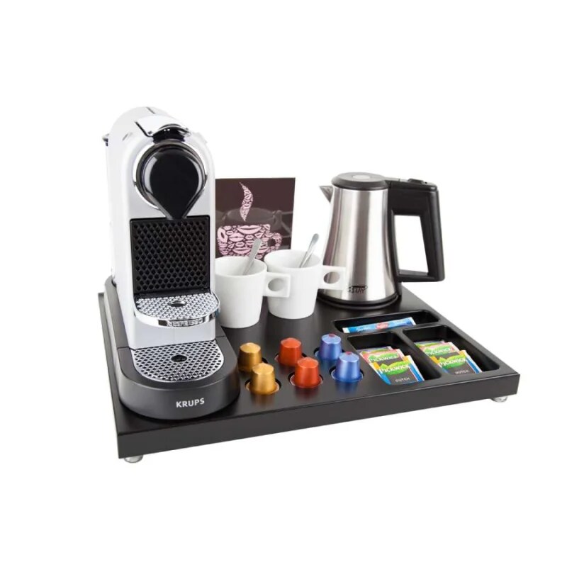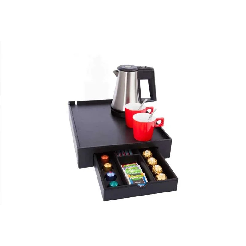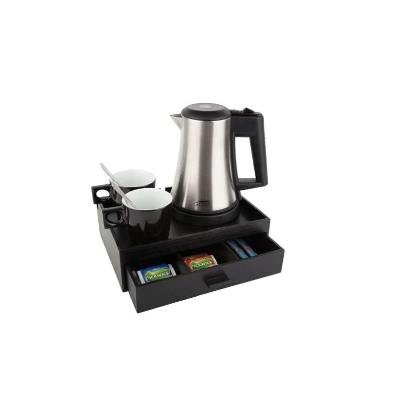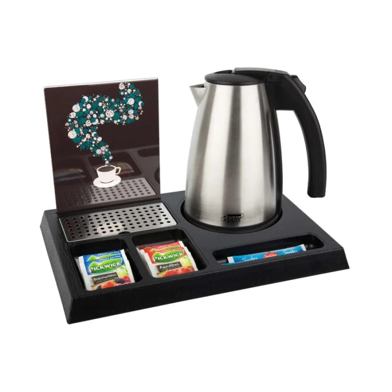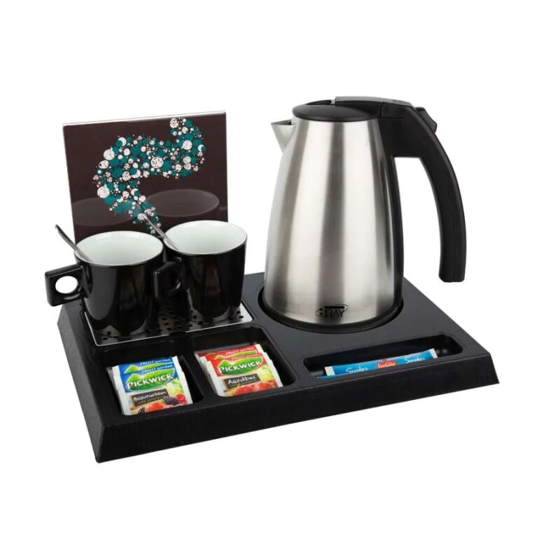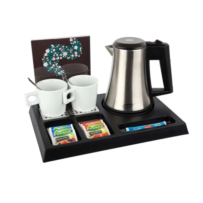 Willkommenstablett SUPREME Schwarz-Braun mit Wasserkocher STYLE 1,0 L Edelstahl und A5 Prospekthalter