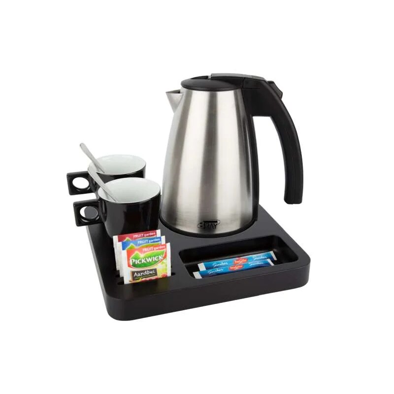 Willkommenstablett SENSE Schwarz mit Wasserkocher STYLE 1,0 L Edelstahl und 2 weiße Porzellantassen