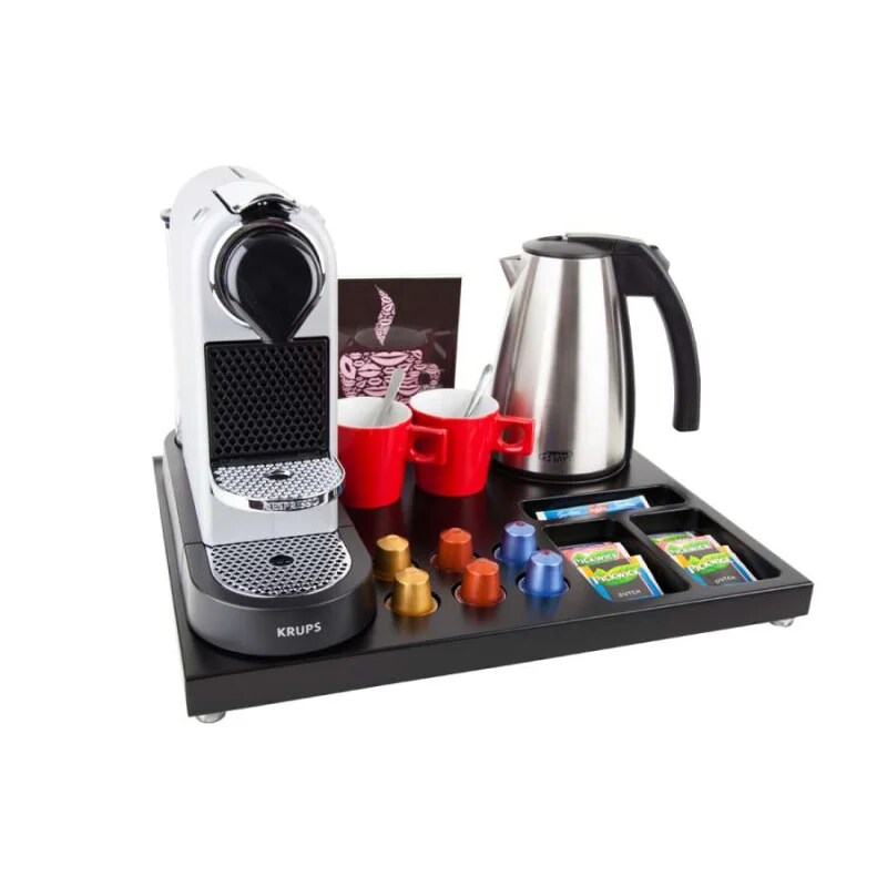 Willkommenstablett SPACE aus Kunstleder Schwarz mit Wasserkocher STAR 0,5 L Edelstahl, 2 roten Porzellantassen und Kaffeemaschine START