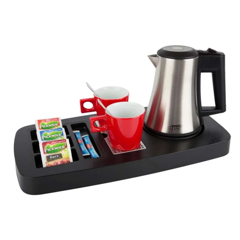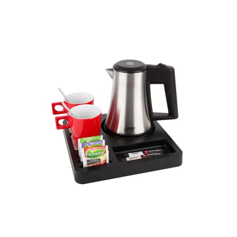 Willkommenstablett SENSE Schwarz mit Wasserkocher STAR 0,5 L Edelstahl und 2 rote Porzellantassen