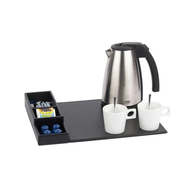 Willkommenstablett SPACE aus Kunstleder Schwarz mit Wasserkocher STAR 0,5 L Edelstahl und 2 weiße Porzellantassen