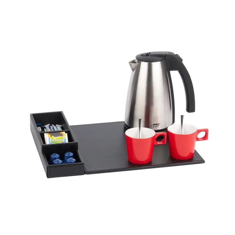 Willkommenstablett SPACE aus Kunstleder Schwarz mit Wasserkocher STAR 0,5 L Edelstahl und 2 rote Porzellantassen