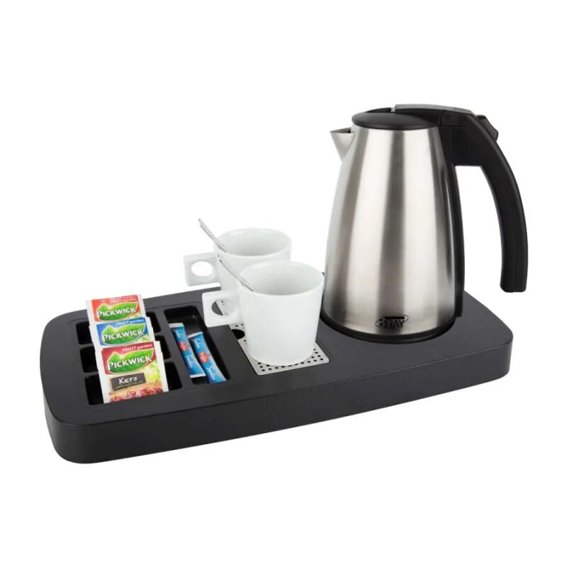 Willkommenstablett STAY Schwarz mit Wasserkocher STYLE 1,0 L Edelstahl und A5 Prospekthalter